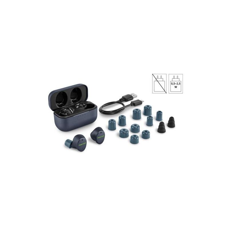 nabíjecí pouzdro, nabíjecí kabel USB, 7 párů špuntů do uší (různé velikosti)