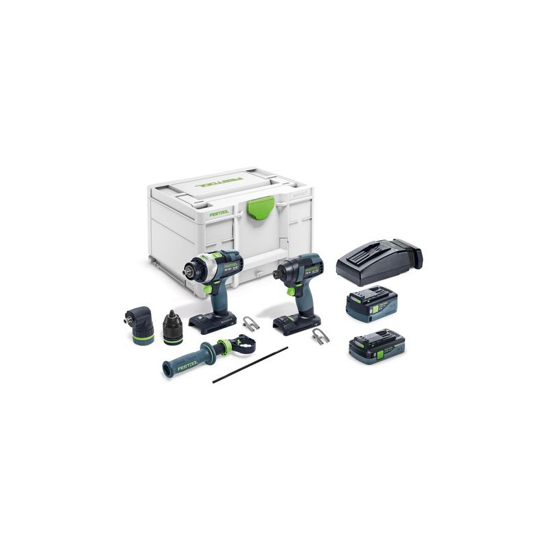 akumulátorový rázový utahovák TID 18, akumulátorový příklepový vrtací šroubovák TPC 18/4, akumulátor BP 18 Li 4,0 HPC-ASI, akumulátor BP 18 Li 5,0 ASI, rychlonabíječka TCL 6, rychloupínací sklíčidlo FastFix 13 mm KC 13-1/2-MMFP, úhlový nástavec FastFix, přídavná rukojeť, spona na opasek, Systainer SYS3 M 237