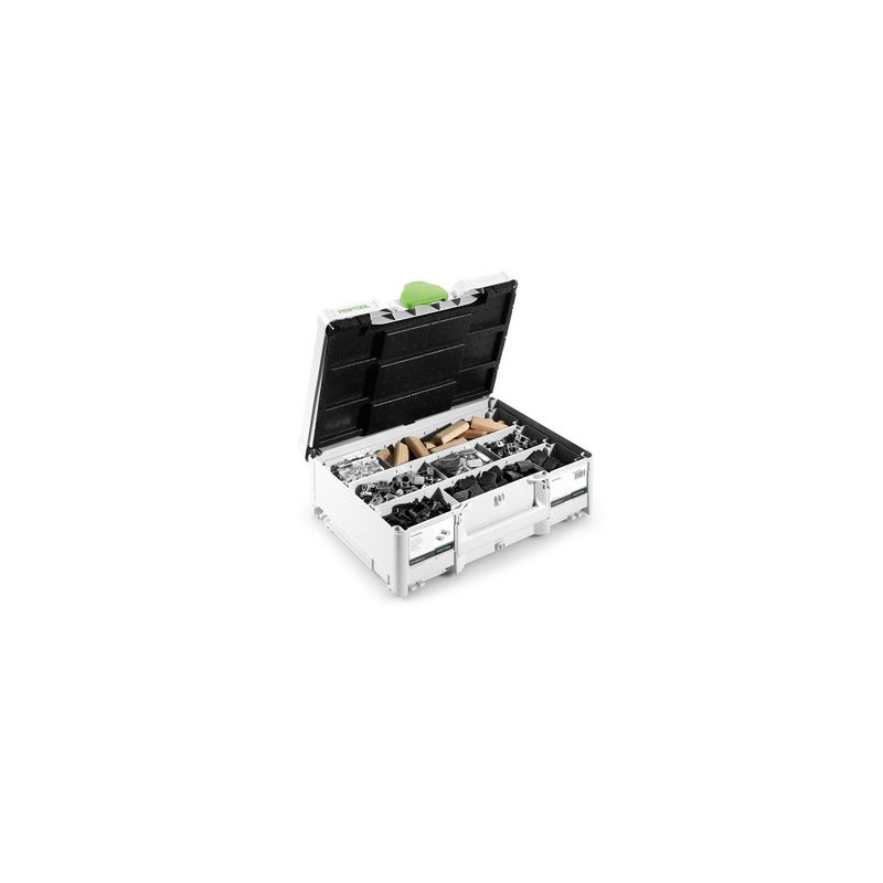 32 kotevních čepů SV-AB D14, 12 x dvojitý čep SV-DB D14, 32 rozpěrných kotev SV-SA D14, Kolík DOMINO buk D 14 × 75, 56 x příčná kotva SV-QA D14, Kolíkový klíč vel. 4, 48 x rozšíření SV-V D14 pro příčnou kotvu, 32 stříbrných krytek SV-AK D14 slr, 32 tmavě hnědých krytek SV-AK D14 brn1, 32 světle hnědých krytek SV-AK D14 brn2, Systainer SYS3 M 137